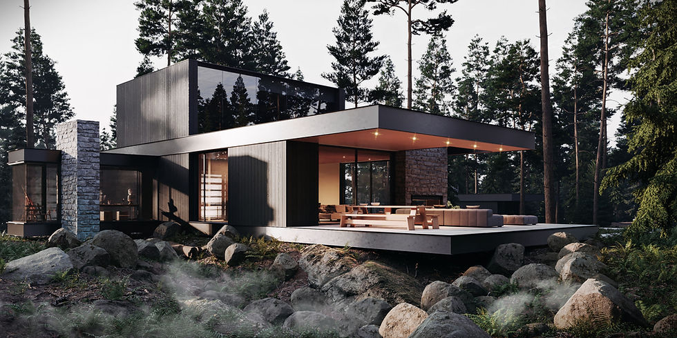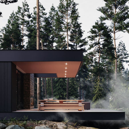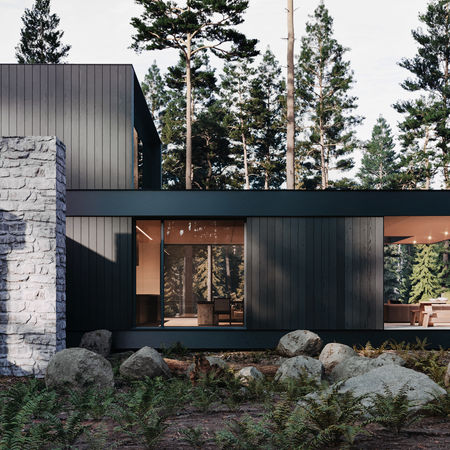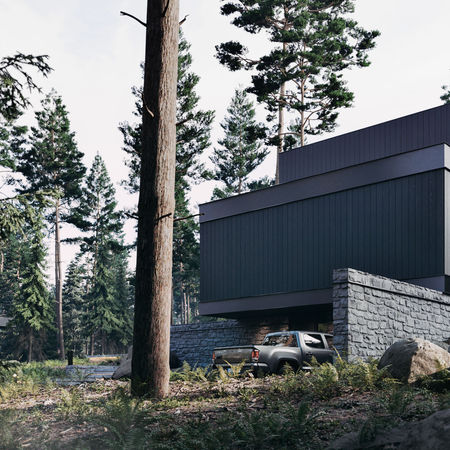 Проект заміського будинку для відпочинку. Поєднання архітектурної стриманості та природної гармонії. Ми реалізували поетапне розкриття взаємодії з простором будинку: від грубої кам'яної зони при під'їзді до витонченого та делiкатного візуального контакту з природою лісу. Фактура грубого природного каменю з рельєфом лісу створює контраст між ритмом міського життя та живою непередбачуваною тишею лісу. Об'єм будівлі інтегровано у ландшафт трьома ярусами, що формують різні рівні взаємодії з природою: - "нульовий" рiвень ізольований,з технічними та побутовими функціями, побудований за принципом невтручання; - "основний" з відкритою взаємодiєю через лісові тераси; - "верхній" - простiр спокою та внутрішнього споглядання. Ключовим елементом проєкту, сформованим запитом клієнта, є кімната для медитацій, розташована над природним яром із відкритими видами на три сторони світу. Цей простір стає не лише архітектурним акцентом, а й смисловим центром, що обрамлює та підтримує звичний для власників формат життя.