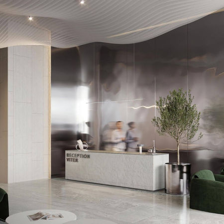 V1TER - це 25-поверховий хмарочос в Дубаї, де ми гармонійно поєднали природну стриманість із виразною динамікою металевих акцентів. Натуральні відтінки та текстури створюють відчуття спокою, тоді як металеві панелі додають ритму сучасного характеру. Цей інтер’єр у V1TER — уособлення легкості, руху та природної гармонії. Простір ніби наповнений динамікою вітру: хвилеподібна геометрія стелі створює відчуття плавного повітряного потоку, що огортає приміщення. Фактурне настінне мистецтво нагадує сліди, які залишає вітер на піску, підкреслюючи природну м'якість форм та рух. Глибокий зелений колір м'яких меблів Minotti символізує баланс та силу природи, а натуральні текстури дерева створюють відчуття тепла. Легкість конструкцій, м’яке освітлення та відкриті зони наповнюють простір відчуттям свободи — так само, як вітер, що безперешкодно проникає у кожен куточок.