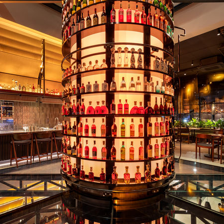 Окрему увагу хочеться приділити центральному ядру закладу – величезній колоні з медійним освітленням, яке змінюється протягом доби, акцентуючи увагу на елітних напоях, які розташовані на ній. Увечері світлові сценарії додають глибини та загадковості, перетворюючи її на світловий арт-об’єкт.