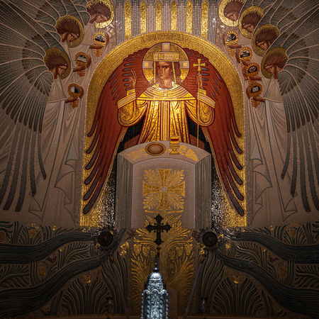 Вітражі підсвічуються ззаду, імітуючи природне світло після заходу сонця, а безоптичні джерела додають ефект зоряного неба. Вузькокутовий прожектор спрямовує промінь на вівтар, акцентуючи ключові елементи під час богослужінь. У поєднанні з димом кадильниці цей промінь створює атмосферу божественної єдності. Враховуючи художню цінність мозаїки у проєкті використано теплі відтінки світла (2800K та 2100K) з високим рівнем кольоропередачі.