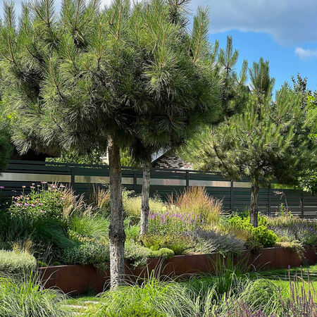 Перепад по висоті обіграний ступеням в газоні та клумбами- підпірними стінками а в якості бордюру ми використали сталь, яку потім обробили для надання ефекту Cor-Ten. З цього ж матеріалу виготовлені клумби.