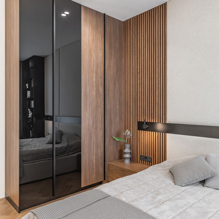 Шафа для одягу та окремою секцією для книг має висувні полиці з підсвіткою для зручного сортування літератури.