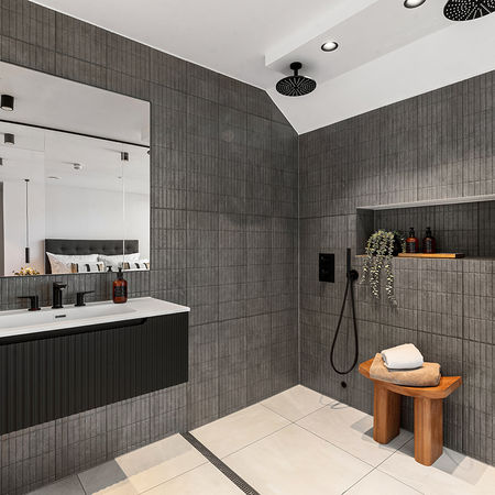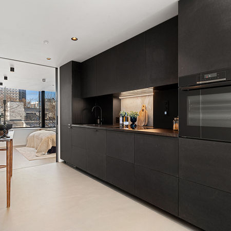 Після успішної співпраці над HG-31, IK-architects і норвезький девелопер Predio представили нову мансарду в центрі Осло — двоповерхову бруталістичну квартиру в стилі Тома Форда. Простір розділено на приватну та публічну зони, з великою кухнею-вітальнею, спальнею, ванною і гардеробом. Збережено автентичну бетонну стіну, що стала основою інтер’єру. Темні кольори врівноважують тепле дерево, червоний метал і блакитне мистецтво. Чорні металеві сходи та мікроцемент підкреслюють брутальність. Проєкт поєднує стиль, функціональність і сталий розвиток, підтверджуючи якість співпраці Predio та IK-architects.