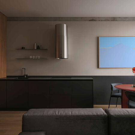 Частково відкриті бетон, цегла й колони додають характеру. Кухня інтегрована у загальний об’єм, а теплі відтінки, дерева та металу створюють баланс між урбаністикою й затишком. Спальня має приховане робоче місце, гардеробну.