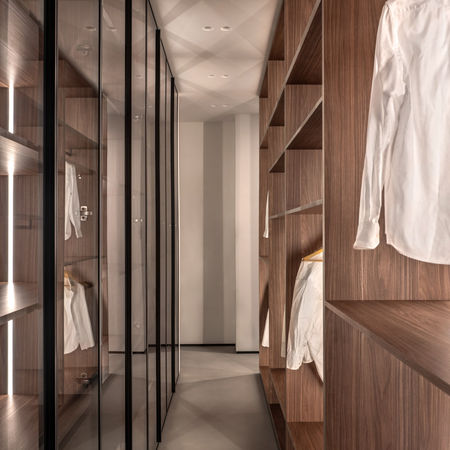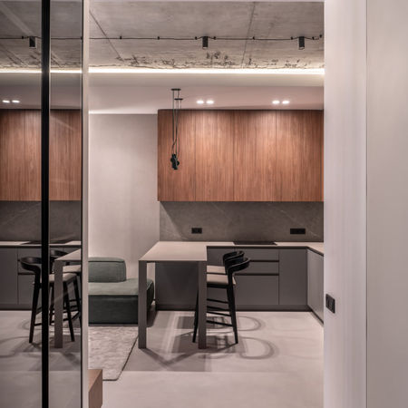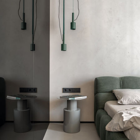 У матеріалах переважають натуральні фактури та стримана кольорова палітра. Бетонна стеля та сіра декоративна штукатурка на стінах задають інтер'єру ритм, який оживлюють яскраві смарагдові акценти — у текстилі, меблях та деталях. Скляні панелі додають легкості та глибини простору.