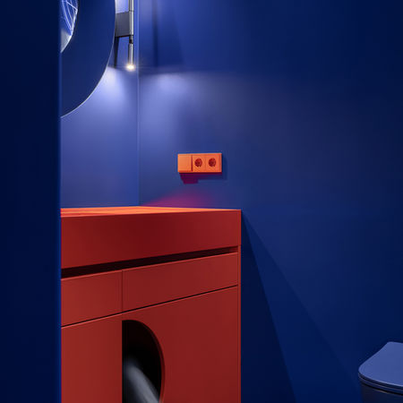 На завершення - кобальтовий санвузол з яскравими червоними акцентами та секретним отвором в тумбі для улюбленої киці. Підкреслюючи вподобання клієнтів і увагу до свого улюбленця.