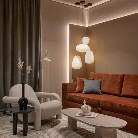 Ми обрали природну палітру, що нагадує глину та пісок. Теплі дерев'яні елементи створюють затишок. Меблі та декор додають кольорові акценти.