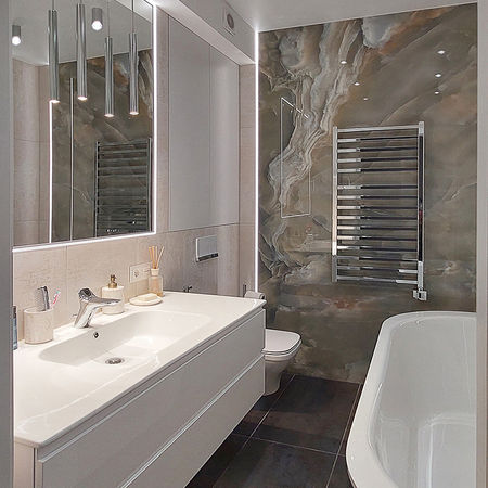 Робота над цим простором розпочалася з перепланування, обговорення необхідності та самодостатності різних зон. Вдалося виділити окремий простір для двох санвузлів ванною та душовою, а в зоні кухні-студії з'явилася можливість розмістити острів за наявності столу та зону відпочинку з великим диваном. У стильовому відношенні присутній легкий натяк на неокласику. Кольорова гама квартири побудована на ньюансах із контрастними елементами. Освітлення поділено на багато груп, завдяки яким можлива різна світлова насиченість та режисура.