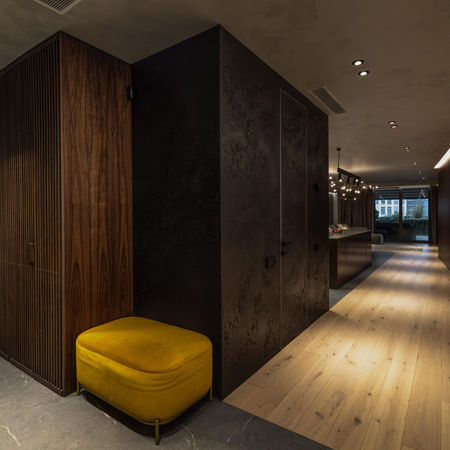 Інтер'єр виконано в теплих затишних кольорах з використанням дерева та кам'яного шпону.