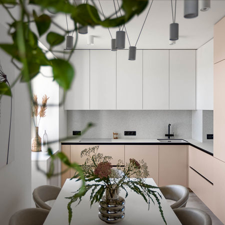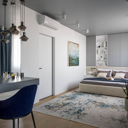 Дворівнева квартира площею 130 м2 розташована у спальному районі Києва. Вона знаходиться на 16 поверсі, звідки відкривається неймовірний вид на зелений бульвар і панораму міста. Основною задачею дизайнерки було розробити функціональний і комфортний сучасний дизайн для родини із чотирьох людей: батьків і їх двох дорослих дітей. Також в квартирі проживатимуть двоє пухнастих улюбленців.