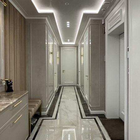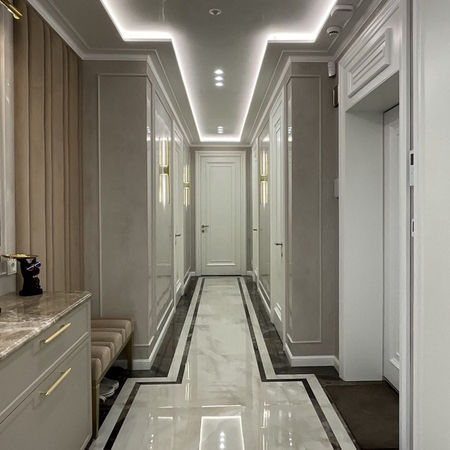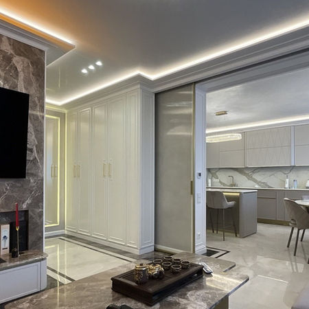 Гармонію та затишок створюють м’які, світлі відтінки, елементи класичного декору, тепле освітлення. Елегантні меблі (усі, без винятку) виконані українськими виробниками по дизайну та технічному заданню автора проекту.