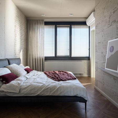 Обладнання, яке дозволило б створити комфортний клімат за мінімальних витрат в цьому київському помешканні, передбачало покриття 70% площі підлоги керамогранітом. Використання такої кількості керамограніту, відкритого бетону та газобетону в інтерʼєрі приховувало ризик отримання холодного та некомфортного житлового простору. Однак, як неважко це визнати, ми недооцінили здатність цих брутальних матеріалів створювати абсолютно затишні та мʼякі за відчуттям житлові приміщення. В цьому проекті їх симбіоз впевнено зачаровує своєю силою та фундаментальністю, створює відчуття спокою, впевненості та безпеки, демонструє здатність бути візуально оксамитовими та затишними, змушує закохатись в себе, огортаючи енергією захищенності, дозволяє розслабитись та неспішно, із задоволенням, споглядати безтурботність горизонту з висоти поверхів...
