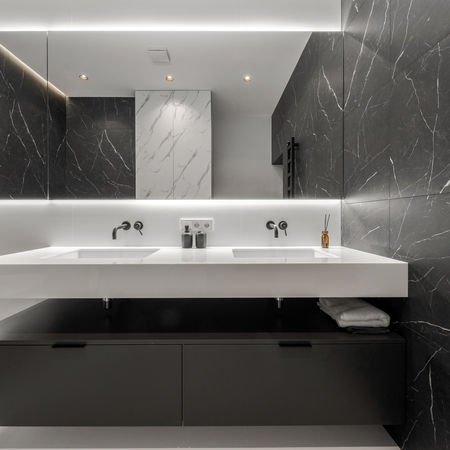 Світла квартира в сучасному стилі з панорамними вікнами Ця квартира — втілення гармонії сучасного мінімалізму та функціональності. Простора вітальня з панорамним склінням наповнена природним світлом, а стримана палітра відтінків створює атмосферу спокою й комфорту. М’які фактури меблів поєднуються з глибокими контрастами кухонного простору — чорним кам’яним фартухом і графітовими акцентами. Зонування виконане делікатно, з використанням скляних перегородок і природних матеріалів. Квартира ідеально підходить для тих, хто цінує якість, естетику та світло у кожному куточку свого простору.