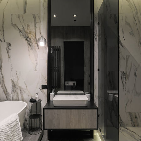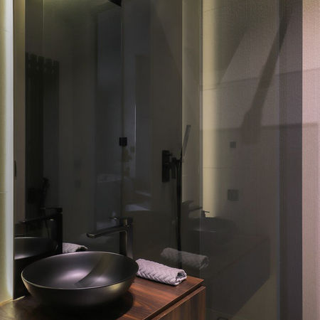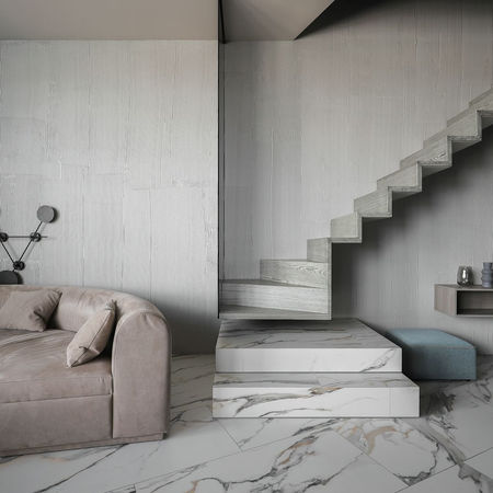 Дворівневий пентхаус, на першому рівні студія, а на другому приватна зона з двома кімнатами. Інтер'єр виконаний в світло сірих відтінках з додаванням пурпурових та блакитних акцентів. Простір насичений декоративними елементами та поверхнями і ніби перетворюється на арт-об’єкт.