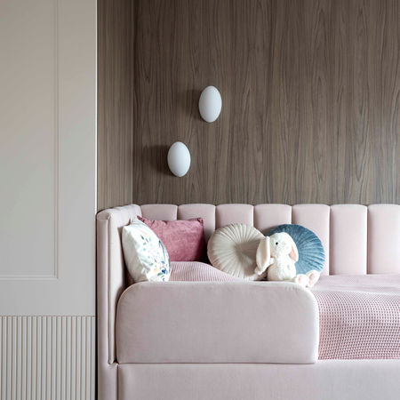 Розміри дитячої кімнати дозволили втілити всі побажання батьків та дитини. У стриману гамму дитячої кімнати додали рожеві та блакитні кольори, чарівним декоративним елементом стали намальовані квіти на стіні.