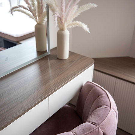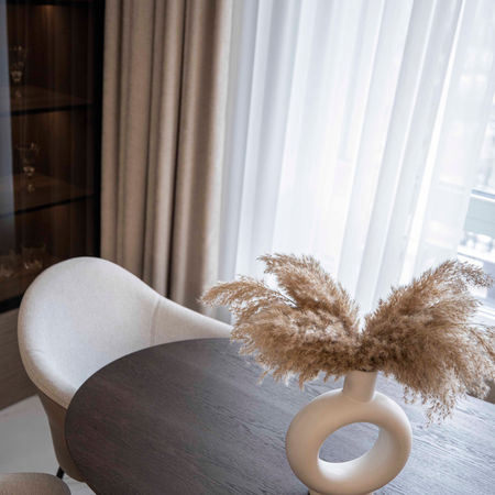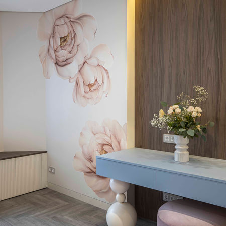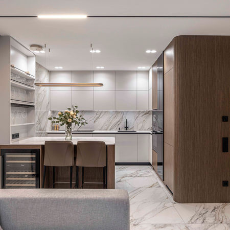Простора, світла та елегантна квартира створена для молодої родини. Стиль інтер'єру — сучасний з елементами класики, в якому поєдано різні цікаві текстури мармуру та дерева, натуральний шпон та інші тактильно приємні елементи.