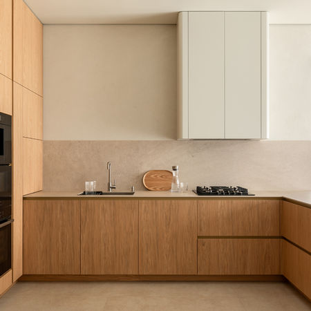 Кухня та передпокій об'єднані єдиною системою дерев’яних панелей, що створює ефект монолітності та візуально стирає межі між зонами.