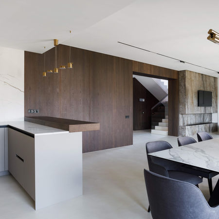 В оздобленні інтер'єру ми використали двері та плінтус прихованого монтажу , профіль тіньового шва, покриття підлоги мікроцементом. Ці елементи є невід'ємними частинами даного інтер'єру - це не тільки красиво, а й дозволить захистити його у первозданному вигляді протягом багатьох років.