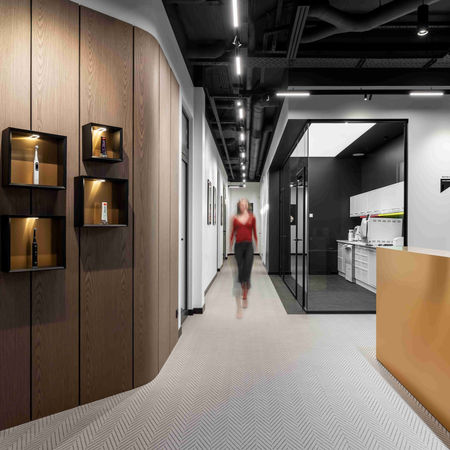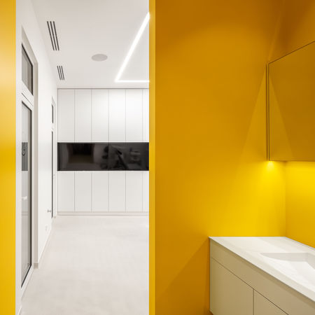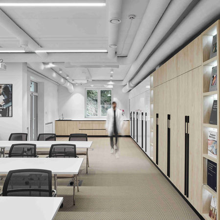 Ми відокремили її від зони очікування, це дозволило створити виняткову атмосферу позбавлену сторонніх очей. В розпоряджені рецепціоніста також гардеробна кімната та міні-кухня для обслуговування пацієнтів. Сама рецепція виконана у монументальній формі, та оздоблена листами міді, а довкола нас оточують дерев'яні елементи зі шпону горіха. Скляний куб що розташований позаду, призначений для демонстрації лікувальних планів та переговорів, це вийнятковий простір, котрий в разі необхідності може бути абсолютно приватним. В холі нас також зустрічає серце стоматології – стерлізаційна кімната. Вона розташована за склом, таким чином кожен може переконатися у технологічному наповненні та процесу стерлізації робочого інструменту.