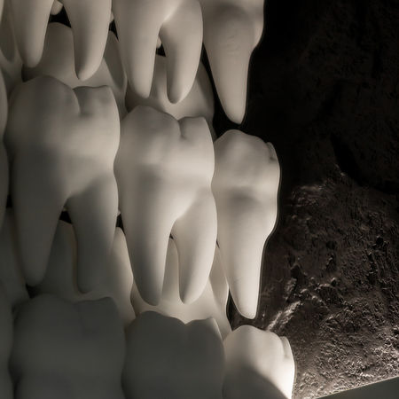 Печера як ознака безпечного місця, де турбота про пацієнта на першому місці, сучасні металізовані поверхні визначають характер інтер'єру, а графічні вкраплення видають його призначення, темні елементи обгортають та спонукають до релаксу. І тут про стоматологічну клініку.