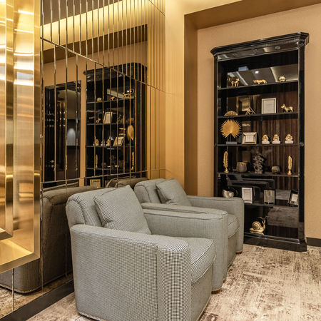 Інтер'єр виконаний у спокійних теплих відтінках із використанням виразних натуральних текстур каменю та дерева. Оздоблення стін виконано шпалерами з одного боку та дзеркальним панно з іншого, такий прийом використаний для візуального збільшення простору. Декоративні рами у поєднанні з натуральним каменем є акцентними елементами та виграшним фоном для ювелірних вітрин. Глянцеві майже дзеркальні поверхні меблів у контрасті з м'яким текстилем створюють особливу атмосферу. Класичні лінії багетних рам та сяйво масивної люстри надають приміщенню флер аристократичної елегантності. Такий інтер'єр, неодмінно підкреслить престиж виробів, що представляються, після зустрічі, з якими неможливо піти з «порожніми руками».