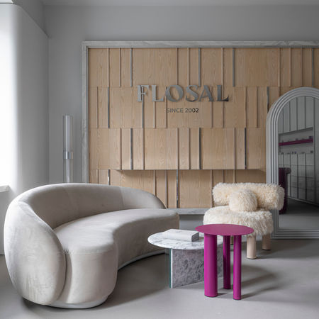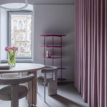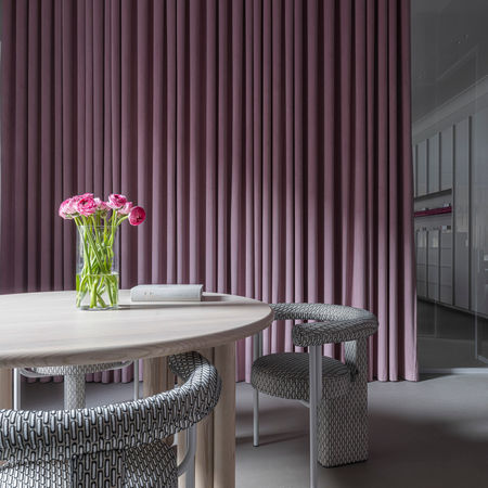 Інтер’єр побудований на контрасті. Нейтральний світло-сірий фон виступає основою, а яскраві акценти у фірмовому кольорі бренду — маджента — задають настрій та візуальну динаміку.