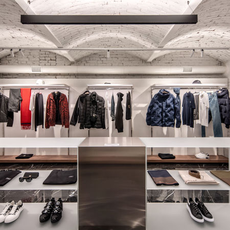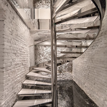 Білий цегляний звід наче зберігає подих минулого, в той час як чорний мармур під ногами віддзеркалює ритм сучасного міста. Дзеркала розчиняють межі простору, а метал і світло малюють архітектурну музику, де кожен елемент — як нотка стилю. Інтер’єр існує поза модою — він її випереджає.