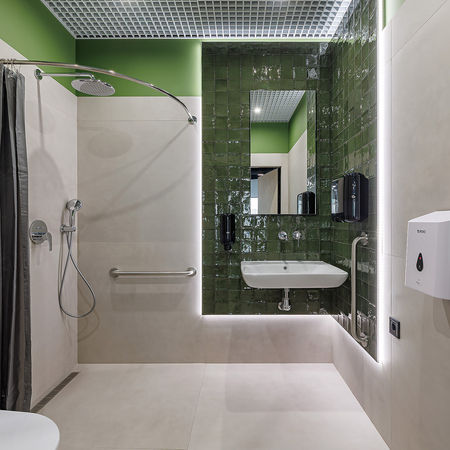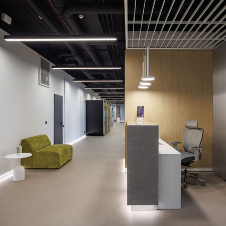 Проект сучасного офісного простору, розроблений з урахуванням потреб ІТ-компаній. Основою інтер’єру став світлий опенспейс із панорамним склінням з трьох боків. Простір ретельно зоновано: центральне місце займає кухня як зона неформального спілкування, а робочі кімнати, переговорні та технічні приміщення логічно розташовані для максимального комфорту. В проєкті акцент на практичність і зручність. Кольорова палітра — стримана, з акцентом на глибокий зелений, який додає простору спокою та балансу.