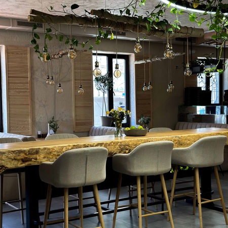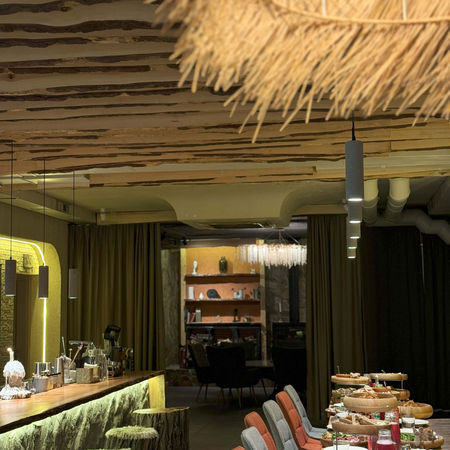 Простір ресторану розроблений з акцентом на комфорт і атмосферу, де кожен елемент дизайну продуманий до дрібниць. Сучасні лінії, теплі кольори та елементи натуральних матеріалів створюють затишну і водночас елегантну обстановку. Ідеальне місце для тих, хто цінує не тільки смачну їжу, але й унікальне середовище для відпочинку та зустрічей.