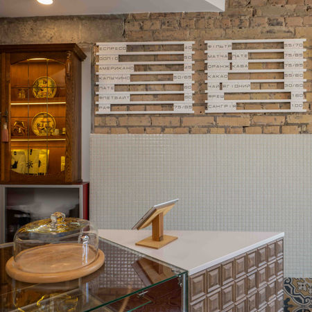 Кав'ярня «Сервант» K1 розташована в місті Києві за адресою: вулиця Кирилівська, 38, на розі з вулицею Оленівською. Будівля, в якій знаходиться кав'ярня, є частиною модерністського ансамблю житлових кварталів біля станції метро «Тараса Шевченка». Ці квартали зводилися в 1986–1993 роках. Архітектори проєкту: Юрій Шалацький, Леонід Мороз, Тетяна Лазаренко та Ігор Шпара. Кав'ярня займає два окремих приміщення, які колись виконували іншу функцію. Раніше одне з них слугувало запасним виходом до під’їзду та сходової клітки. Обидва простори мають нетипову для закладів такого типу трикутну форму. Це наштовхує на думку, що спочатку приміщення могли бути запроєктовані як технічні або складські. Усередині залишилося багато відкритих комунікацій, які за конструктивними обмеженнями не можна було приховати за стінами чи стелею. Саме тому в інтер’єрі кав'ярні з’явилися штори, які виконують не лише декоративну функцію, а й забезпечують легкий доступ до труб та інших комунікацій для зручного огляду й обслуговування. Також завдяки надбудові балкона над цими двома приміщеннями внизу утворився маленький критий майданчик. Ми використали його та облаштували затишну терасу. Концепція та бачення клієнта Ідея майбутньої мережі кав’ярень виникла під час обговорення із замовником, коли він із захопленням ділився баченням закладу — атмосферного простору, що нагадує гостювання в родичів, із вінтажним посудом та сервантами, наповненими унікальними предметами. Побачивши щиру зацікавленість, ми почали систематизувати ці образи та формувати єдину концепцію. Результатом стала цілісна ідея мережі: розроблено фірмову палітру, підібрано матеріали, окреслено принципи оформлення інтер'єру та створено базову візуальну концепцію логотипу для вивіски. Фасад вирішили зробити виразним, але без надмірної екстравагантності — з урахуванням архітектурного стилю будівлі та оточення. Замовник хотів використати склоблоки як декоративний елемент. Оскільки всередині це було неможливо через товщину матеріалу та обмежений простір, склоблок інтегрували у фасад, зберігши ідею й додавши характерного акценту. Деталі, архітектура простору та процес створення дизайну Барну частину розмістили в лівому приміщенні, посадкову зону — в правому, де знайшли каналізаційний стояк і спроєктували санвузол. Оскільки бар займає більшу частину лівого приміщення, там помістилася лише стояча барна стійка. Праворуч — повноцінна посадкова зона. Спершу планували пофарбувати стіни в лівому приміщенні, а в правому — покрити їх штукатуркою. Але після очищення цегли побачили піщано-жовтий відтінок, що збігається з фірмовим стилем кав’ярні, тож залишили її відкритою, покривши лаком. У правому приміщенні по стелі йшли металеві балки з потьоками іржі. Разом із замовником вирішили їх залишити — вони створюють природний орнамент і додають текстури. Стеля має незвичну геометрію — прямокутні вставки стали особливою рисою простору. Орнаменти на підлозі гармоніюють із кольором цегли, підкреслюючи цілісність. Стіни бару обклали білою мозаїкою — практичним матеріалом для підтримання чистоти. Меблі підібрали міксовані: вінтажні елементи та бюджетні скандинавські бренди. Дзеркала — всі вінтажні, а жовті світильники повторюють кольорову гаму лівого приміщення та переносять її в праву част