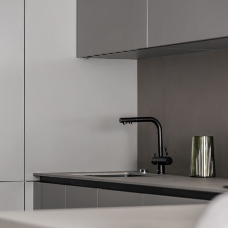 Ключовим елементом інтер’єру стала шафа-перегородка між кухнею та коридором. Вона не лише зонувала простір, а й виконувала роль функціонального ядра квартири. Саме в ній зосереджені всі технічні рішення: інженерні вузли, системи зберігання та комунікації, які повністю приховані від погляду, зберігаючи чистоту й цілісність інтер’єру.