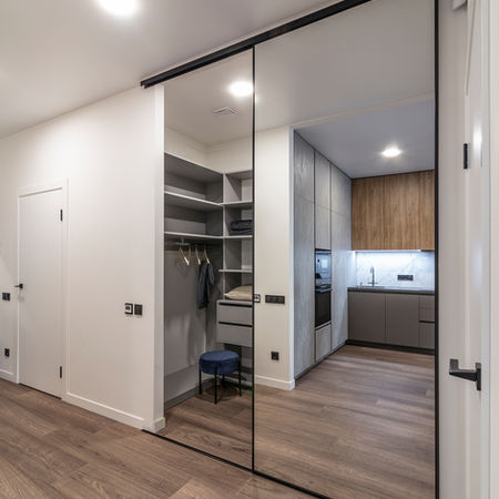 Лаконічні, дуже затишні та функціональні апартаменти, що з самого початку призначені для здачі в оренду. Замовниця просила створити апартаменти з позачасовим інтер'єром, естетика якого протягом тривалого часу була б затребуваною та актуальною. Відповідно цьому невеликі апартаменти площею лише п'ятдесят квадратних метрів вийшли лаконічними, функціональними, візуально просторими і при цьому дуже затишними. Особливо потрібно відзначити гардеробні кімнати, які своєю функціональністю та сучасним дизайном дуже вдало доповнюють ці апартаменти та зможуть забезпечити комфортне життя будь-якій сучасній парі, яка цінує мобільність та простоту.
