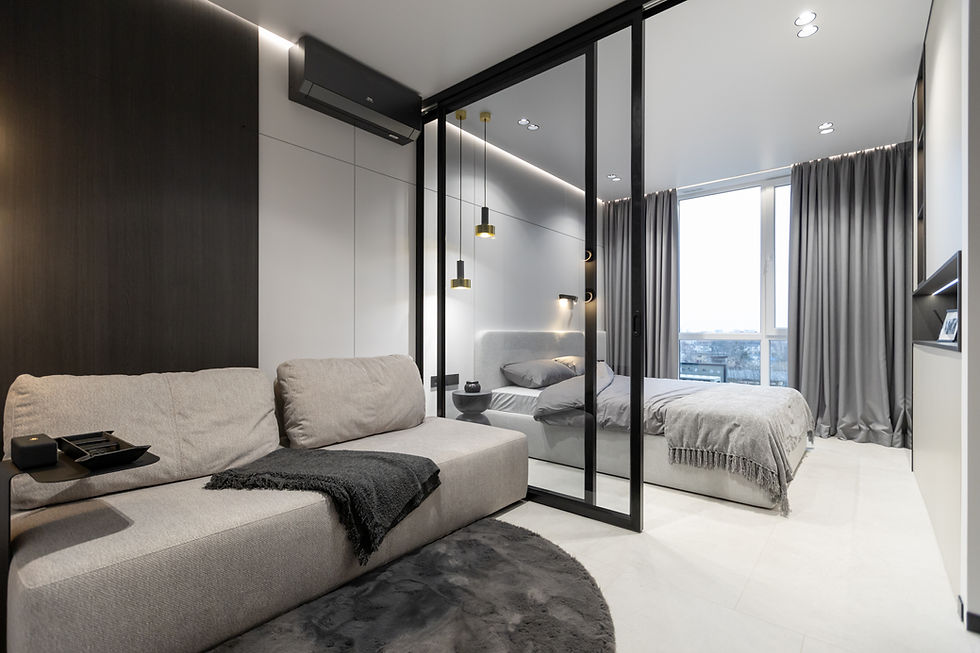 Реалізований інтерʼєр у стриманій кольоровій палітрі. Лаконічно, продумано, на роки. Це про простір, де мінімум зайвого і максимум відчуттів. Світло, глибокі фактури й тиша, у якій хочеться жити. Загальна кімната доповнена скляною перегородкою, що делікатно відділяє спальню, зберігаючи відчуття повітря й цілісності. Кухонна зона продумана до дрібниць: функціональна, зручна, без візуального шуму. Санвузол із дзеркальними дверима в стелю рішення, яке візуально розширює простір і додає глибини.